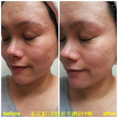 每次用的份量約這麼多,慢慢的按摩,用後不會感到很乾,皮膚的老廢角質都被帶走了,摸上去滑滑的。而且茶花籽油及薰衣草精華更可滋養肌膚,令肌膚回復健康。一星期可用兩至三次。